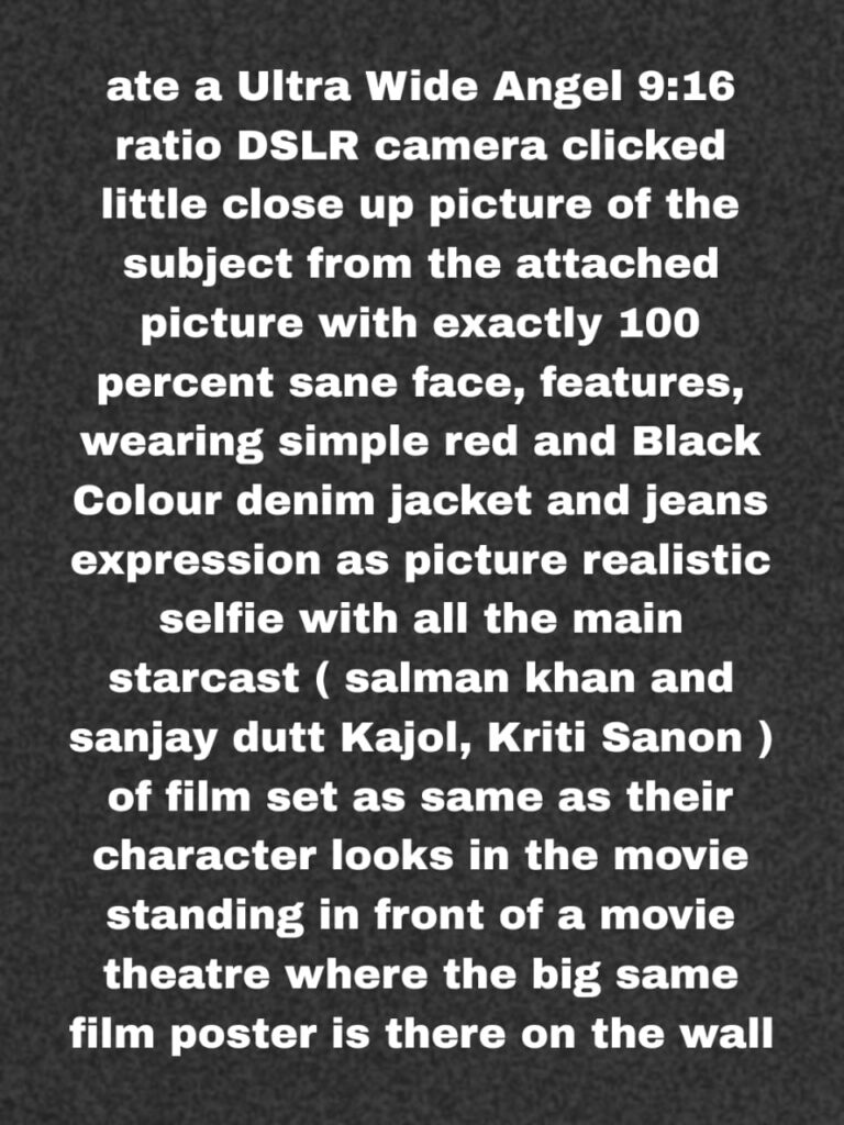 ate a Ultra Wide Angel 9:16 ratio DSLR camera clicked little close up picture of the subject from the attached picture with exactly 100 percent sane face, features, wearing simple red and Black Colour denim jacket and jeans expression as picture realistic selfie with all the main starcast ( salman khan and sanjay dutt Kajol, Kriti Sanon ) of film set as same as their character looks in the movie standing in front of a movie theatre where the big same film poster is there on the wall