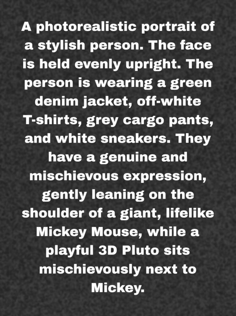 A photorealistic portrait of a stylish person. The face is held evenly upright. The person is wearing a green denim jacket, off-white T-shirts, grey cargo pants, and white sneakers. They have a genuine and mischievous expression, gently leaning on the shoulder of a giant, lifelike Mickey Mouse, while a playful 3D Pluto sits mischievously next to Mickey.